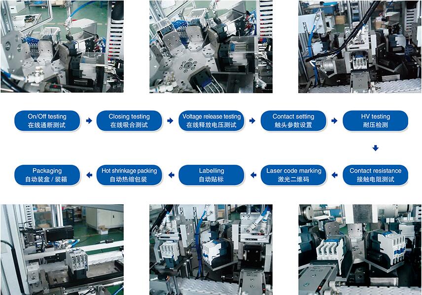楚天光電激光完成交 / 直流接觸器的產(chǎn)品半自動(dòng)裝配,采用人工、部件裝配半自動(dòng)工裝、全自動(dòng)螺絲裝配機(jī)相結(jié)合的模式。自動(dòng)性能指標(biāo)測(cè)試,包含通斷,吸合、釋放電壓、保持功耗、觸 頭參數(shù)、耐壓、主觸頭接觸電阻等。產(chǎn)品包裝:主要包含激光二維碼、產(chǎn)品貼標(biāo),裝盒、熱縮包裝等工序。其中激光二維碼關(guān)聯(lián)到單件產(chǎn)品的所有測(cè)試參數(shù)。實(shí)現(xiàn)物流傳輸自動(dòng)化。